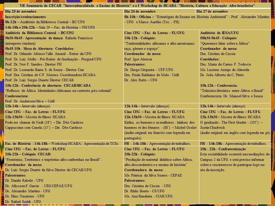 Entre os dias 25 e 27 de novembro, ocorre o VII Seminário do CECAB sobre "Interculturalidade e Ensino de História" e o I Workshop sobre "História, Cultura e Educação Afro-Brasileira". Essa atividade é coordenada pela professora Cristina de Cássia e tem como foco a integração das pesquisas realizadas no âmbito do PPGH com os problemas do ensino de história na escola.