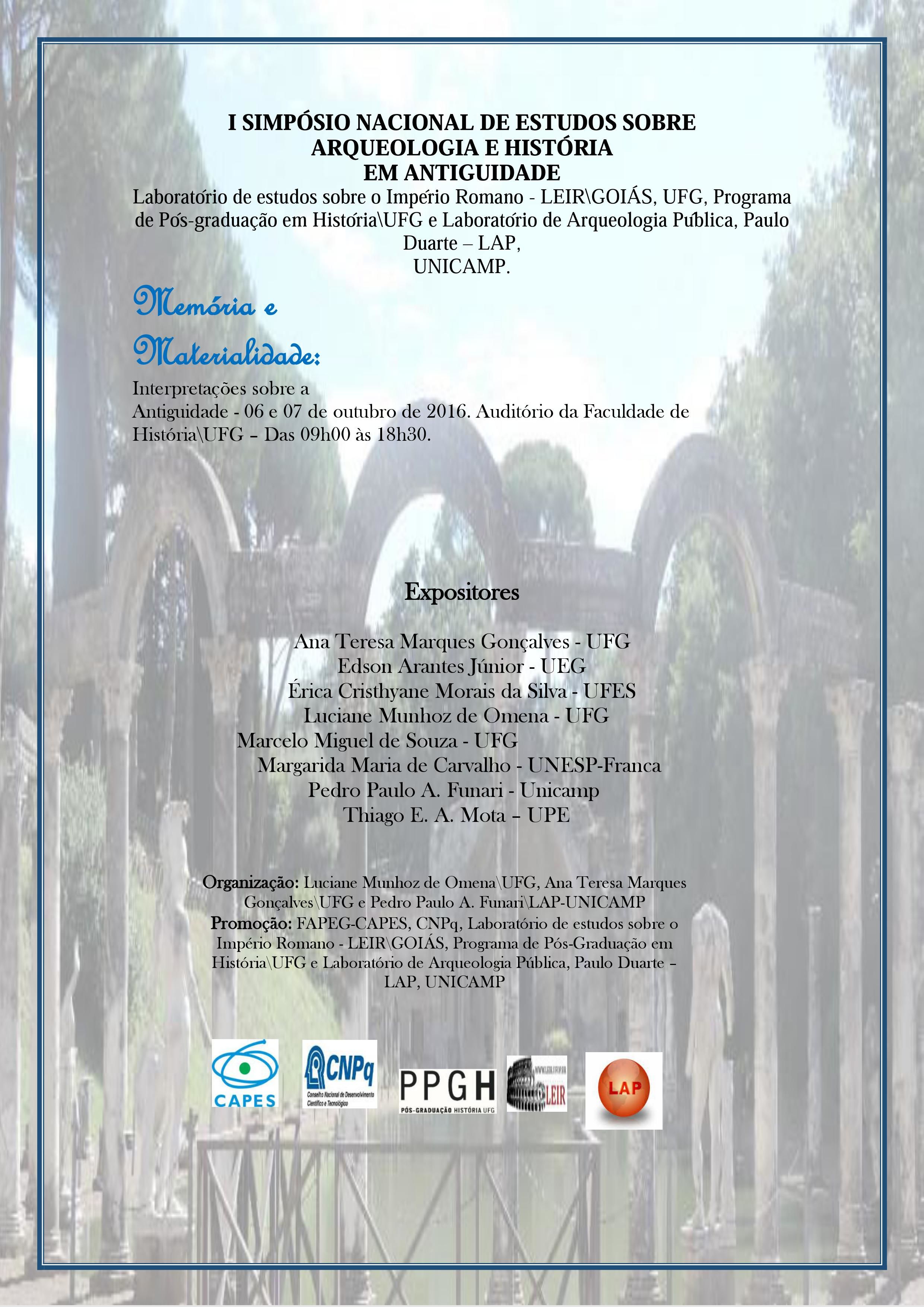 Duarte – LAP, da UNICAMP, promovem o I Simpósio Nacional de Estudos Sobre Arqueologia e História em Antiguidade: Memória e Materialidades: interpretações sobre a Antiguidade. O evento ocorrerá na UFG.