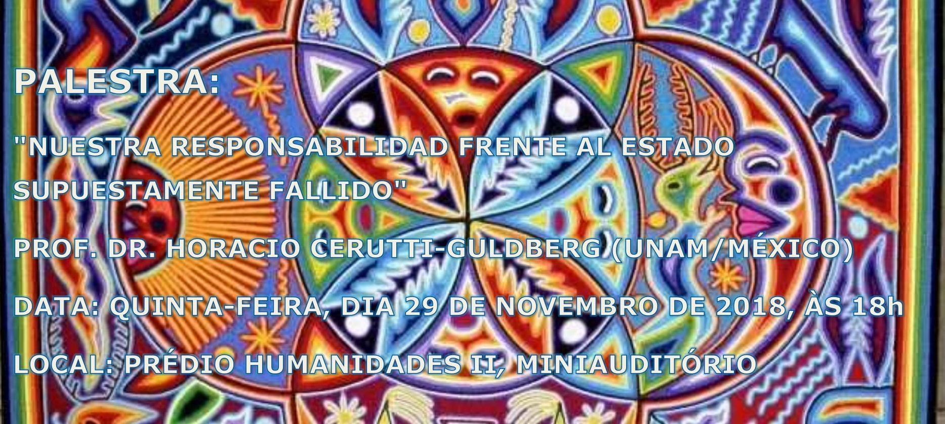 Palestra com o Prof. Dr. Horacio Cerutti-Guldberg (UNAM/México) Evento Local: Prédio Humanidades II, Miniauditório Data do Evento : 29 de Novembro 2018 - 18h às 20h Listar Todas Voltar