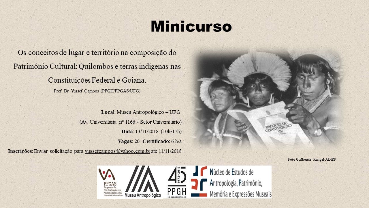MINICURSO: “Os conceitos de lugar e território na composição do Patrimônio Cultural: Quilombos e terras indígenas nas Constituições Federal e Goiana.”