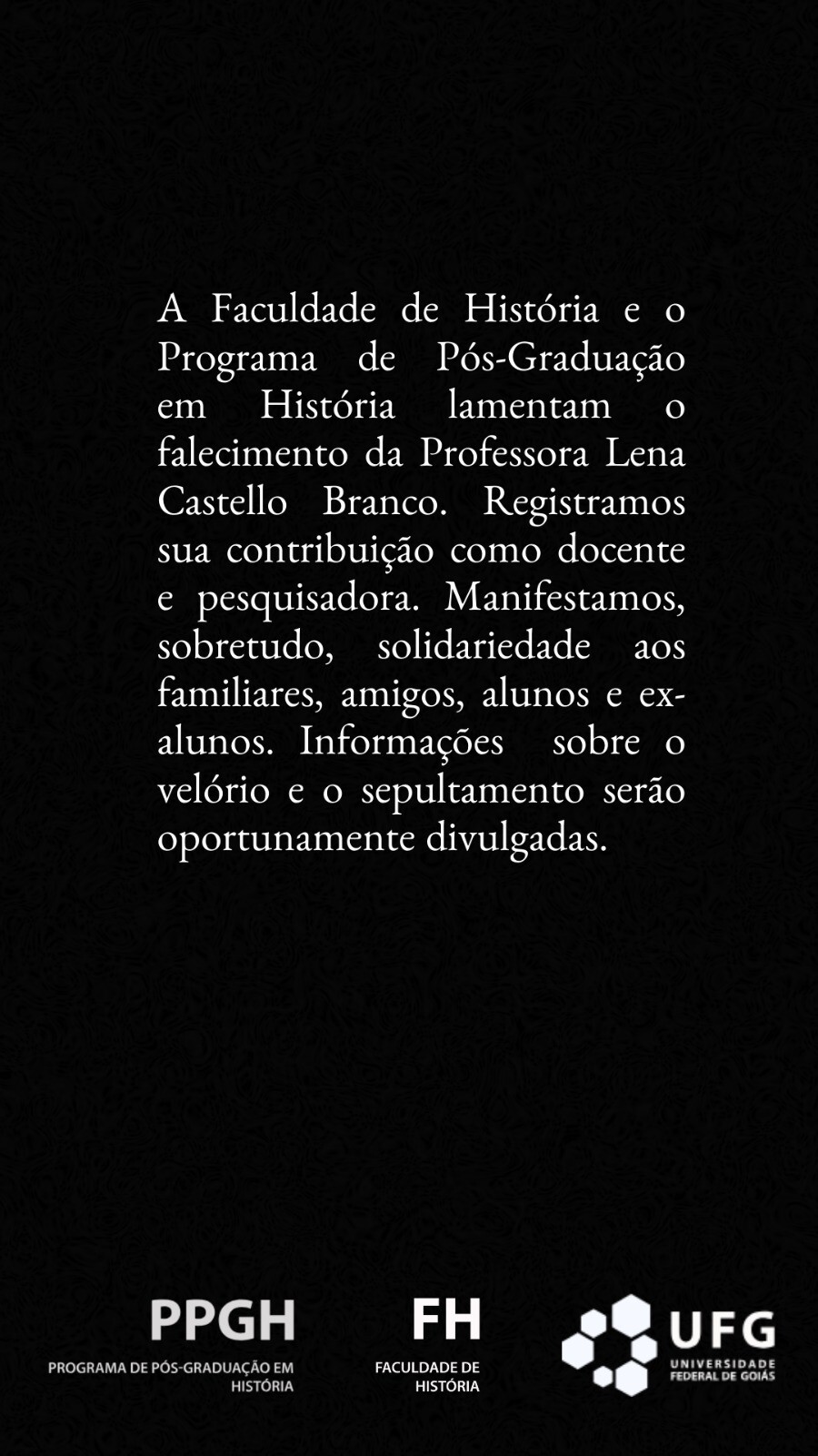 A Faculdade de História e o Programa de Pós-Graduação em História lamentam o falecimento da Professora Lena Castello Branco.